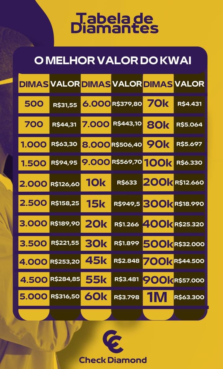 Brilhe em suas lives com a Check Diamond! Diamantes baratos a preço de bombom, com preços e descontos que cabem no seu bolso e pensados para destacar sua presença online através das suas transmissões na plataforma Kwai. Seu sucesso começa aqui!